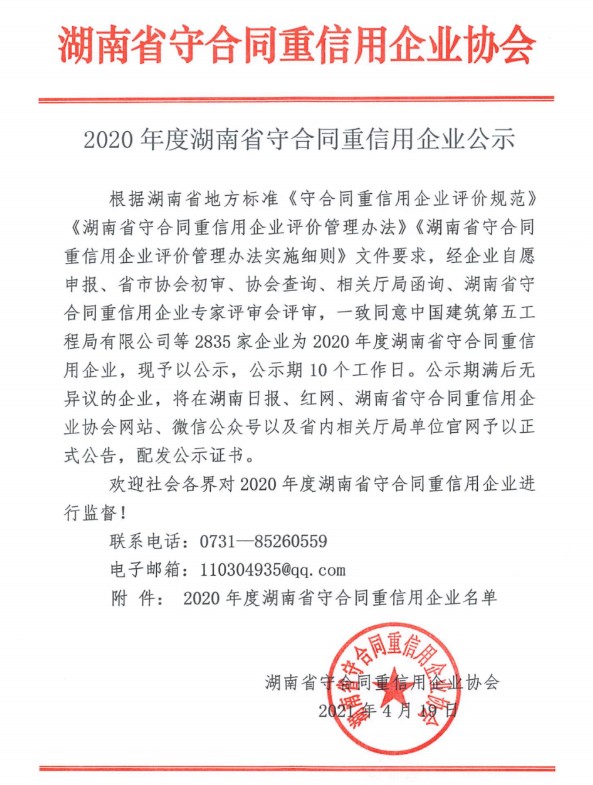 经湖南省守合同重信用企业协会评审,JN江南·(中国)体育官方网站设计研究院有限公司荣获2020年度湖南省“守合同重信用企业”称号,这是设计院连续第三年获得此项荣誉。
