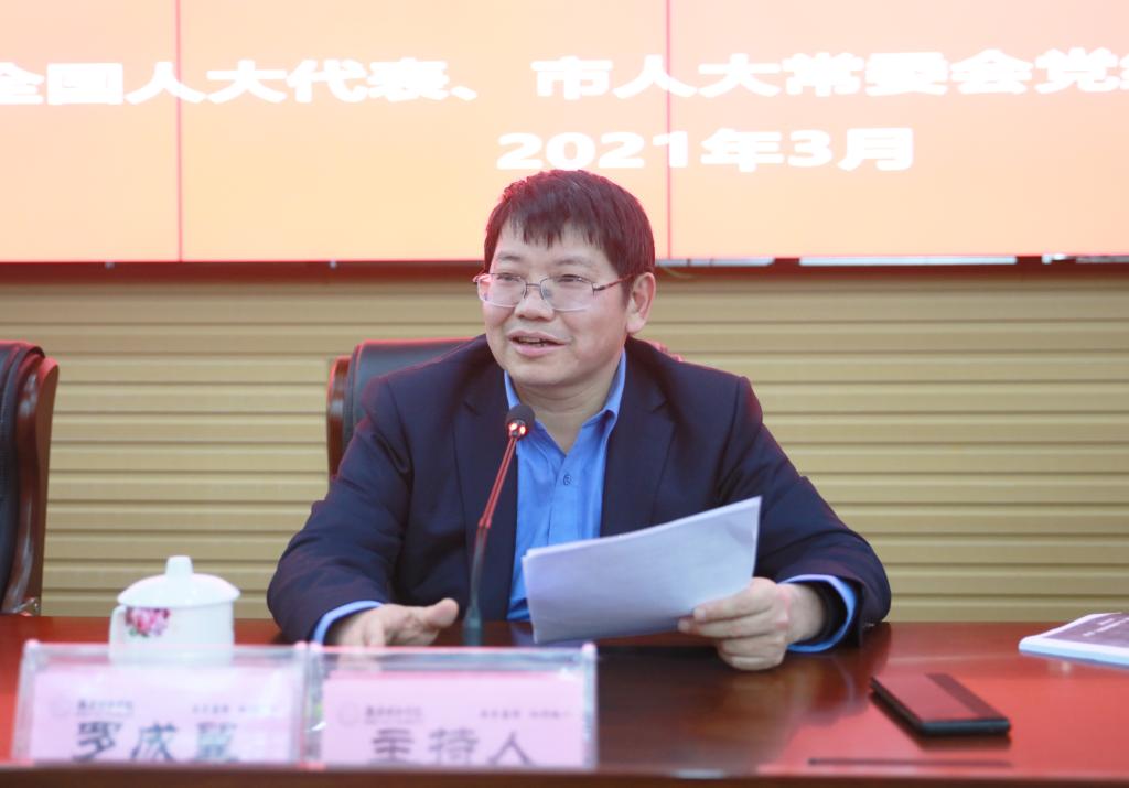 徐云波结合自己参加“两会”的见闻和感悟,从大会概况和特点、习近平总书记两会期间的重要讲话精神、党和国家领导人来团审议时的讲话精神、大会各项报告和规划纲要的主要精神以及湖南代表团及其本人履职情况等几个方面,提纲挈领、深入浅出地阐释了全国“两会”精神。他建议学校立足新发展阶段,贯彻新发展理念,构建新发展格局,将学校发展与国家命运紧密相连。抢抓乡村振兴战略全面实施机遇,积极参与县域城镇和村庄规划建设,在乡村建设中体现担当。抢抓数字经济发展历史性机遇,做优做强湖南新型智慧城市研究院等平台,在数字化发展、数字中国建设中彰显作为。抢抓“一带一路”战略实施机遇,加强优势学科建设和人才培养,加快实现高质量发展。