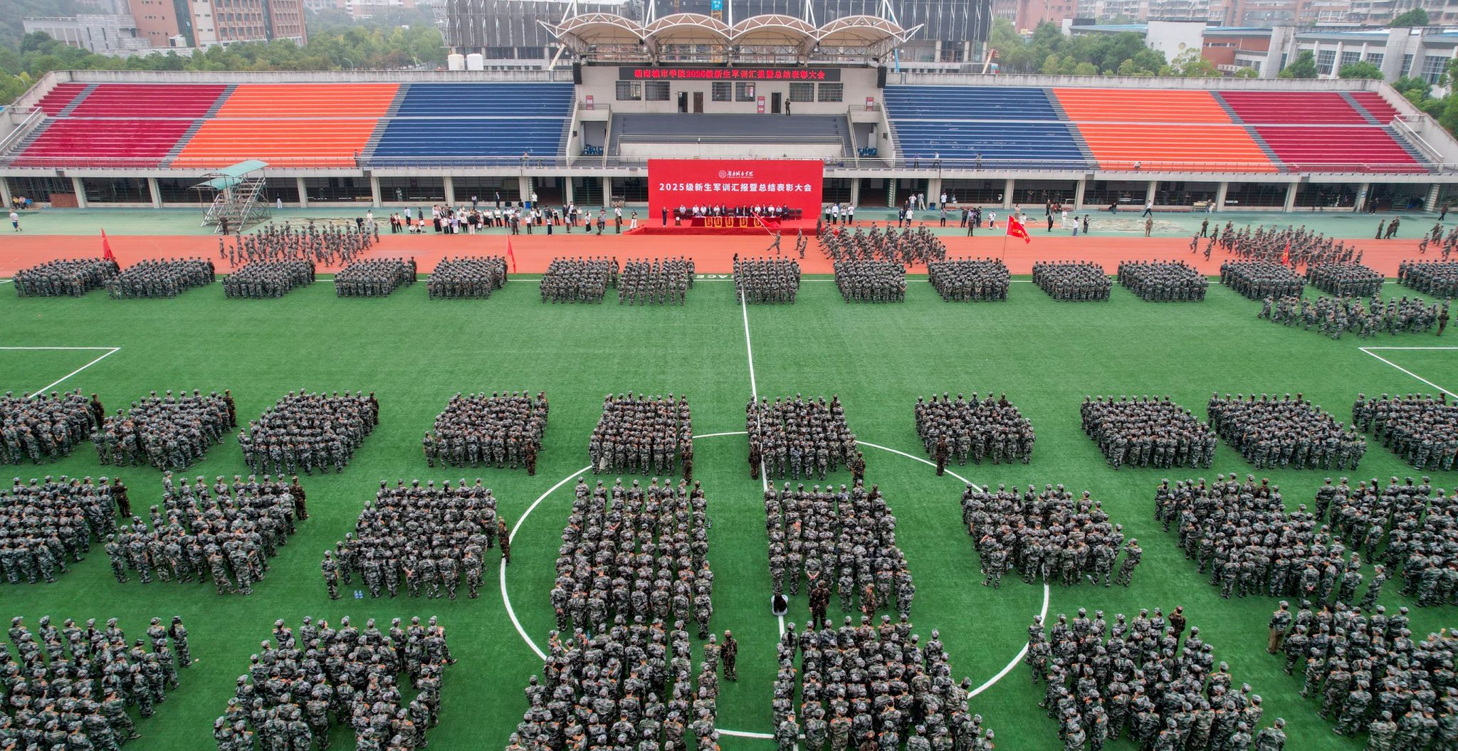 本网讯 9月30日上午8时,JN江南·(中国)体育官方网站2025级新生军训汇报暨总结表彰大会在学校东田径场举行。全场新生身着全套迷彩,以最昂扬的精神面貌迎接来自各方的检验。全体在家校领导出席大会。校党委书记何振宣布军训成果汇报表演正式开始,副校长雷存喜主持大会。