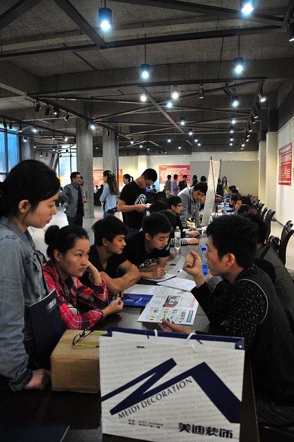 (本网讯)不用出门,在校园就能够参加招聘会。429日下午,苹果装饰等11家知名装饰设计公司“组团”在美艺楼108教室举办了针对美术与艺术设计学院学生的专场招聘会。