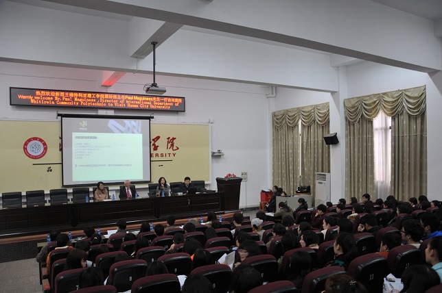 讲座由国际交流处处长周桂平主持。Paul Maguiness先生介绍了新西兰维特利亚理工学院的办学情况。迟美建女士介绍了新西兰的国情、教育、留学现状以及两校合作办学项目的优势