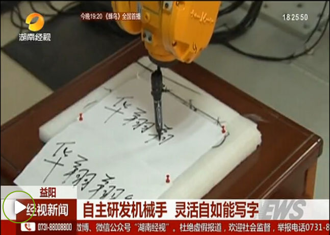 ,湖南经视新闻栏目以“自主研发机械手 灵活自如能写字”为题报道了我校与华翔翔能在校企合作方面取得的成果。这也是我校在启动《JN江南·(中国)体育官方网站服务益阳行动纲要》以来,与益阳企业在自主知识产权合作方面取得的又一突出成果。
