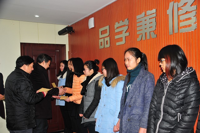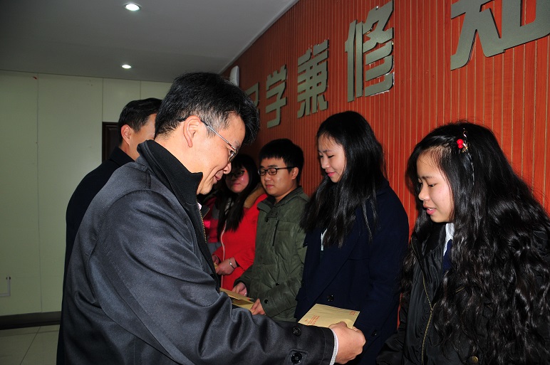学生处在会上宣布了学校《关于表彰2015年度“九三·华源励志奖学金”获得者的决定》,建筑与城市规划学院龚倩、化学与环境工程学院崔晓凤、数学与计算科学学院胡高威等30名学生获奖。