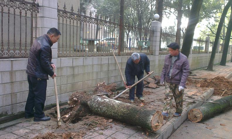 基建与后勤处工作人员清理倒塌树木,并抢修水管
