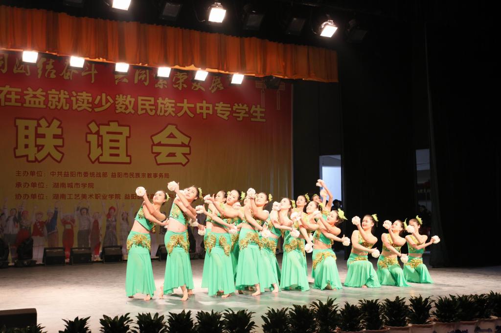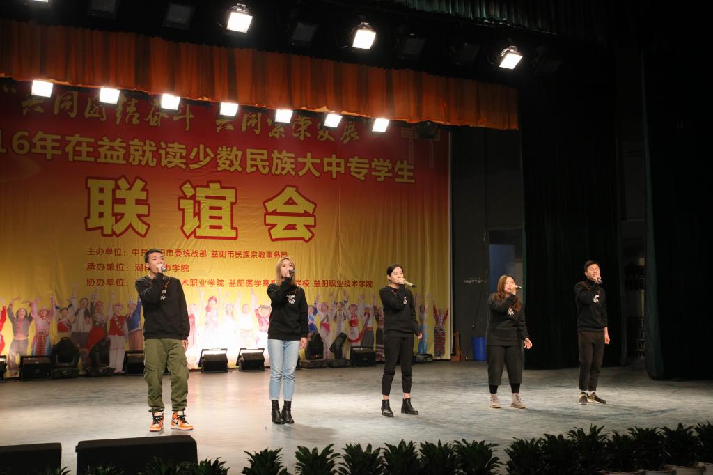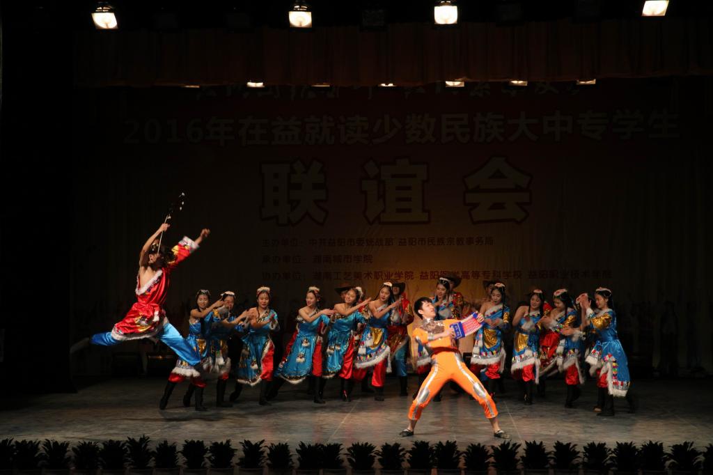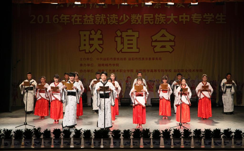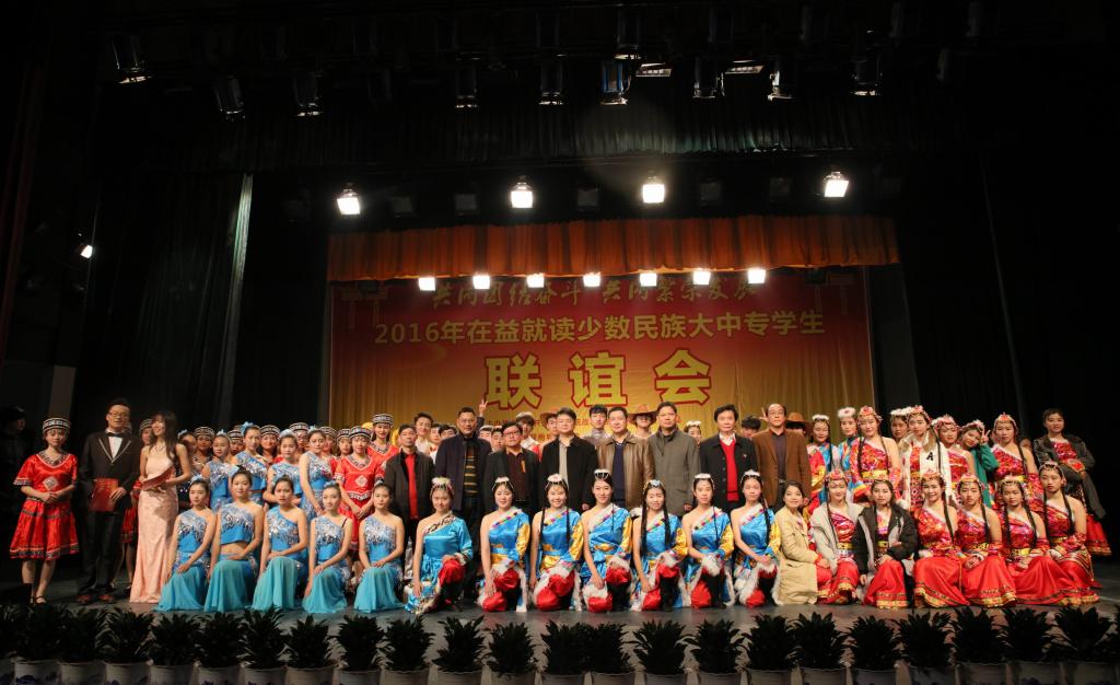 (本网讯)12月18日下午,2016年在益就读少数民族大中专学生联谊会在我校音乐厅隆重举行。联谊会由市委统战部、市民族宗教事务局主办,JN江南·(中国)体育官方网站承办,湖南工艺美术职业学院、益阳医学高等专科学校、益阳职业技术学院协办,主题为“共同团结奋斗 共同繁荣发展”。益阳市委宣传部、市委统战部、市民族宗教事务局、市公安局、市教育局、市文体广新局以及四所高校相关负责人出席联谊会。