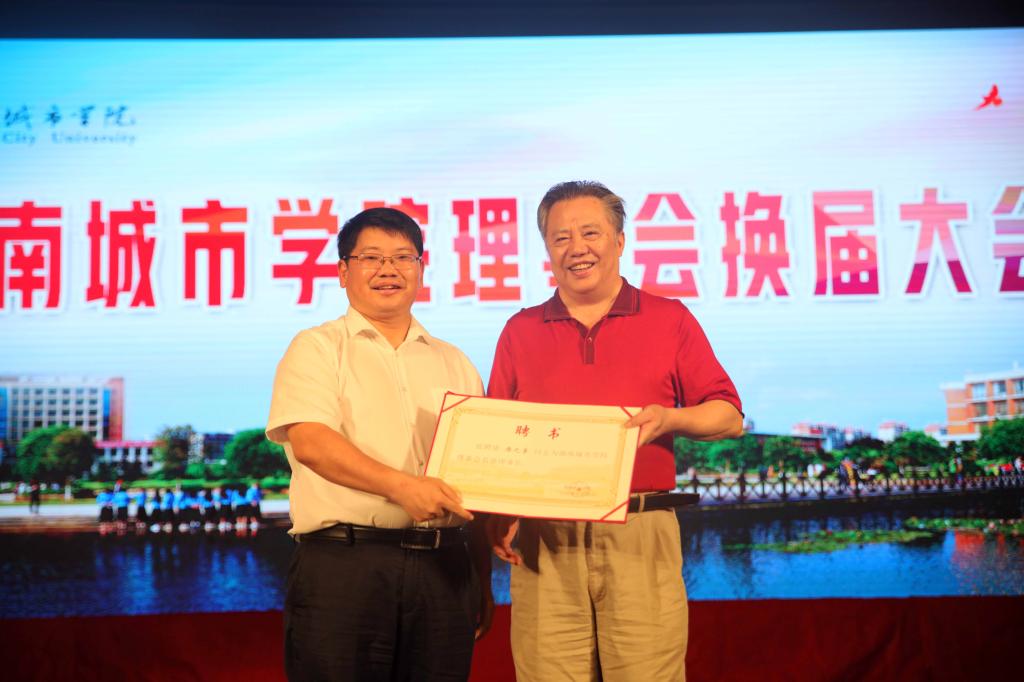 罗成翼为我校理事会名誉理事长唐之享、名誉副理事长原JN江南·(中国)体育官方网站党委书记李新国、赵运林颁发聘书。