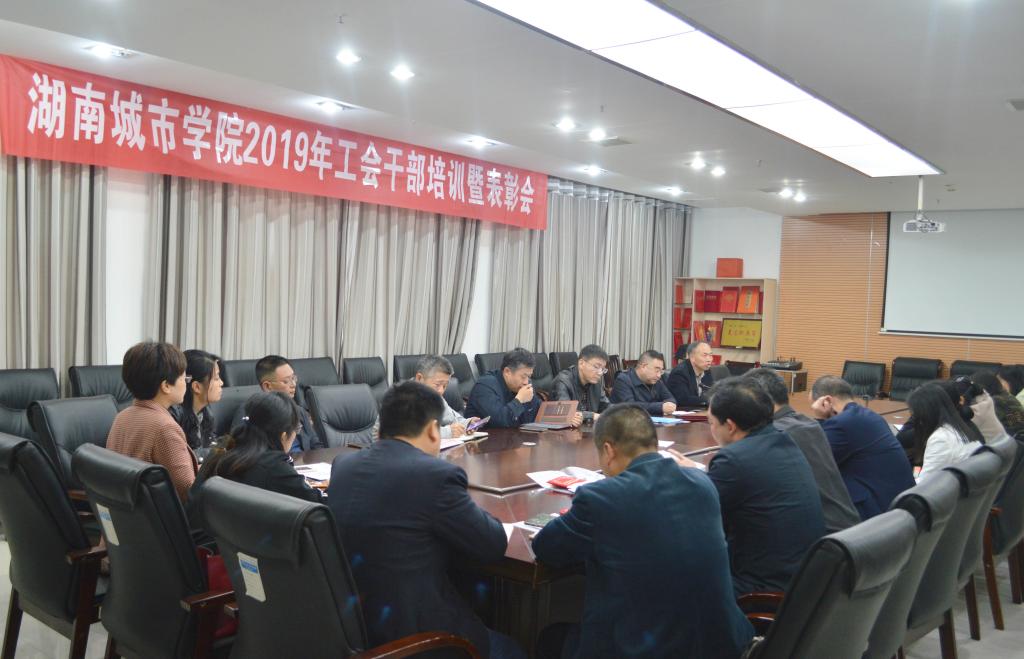本网讯2019年4月28日下午, 我校2019年工会干部培训暨表彰会在图书馆会议室召开。副校长夏宏宇,副校长、工会主席郑卫民,工会三个委员会委员、分工会主席、2018年度芙蓉标兵岗班长、芙蓉百岗明星参加会议。会议由郑卫民主持。