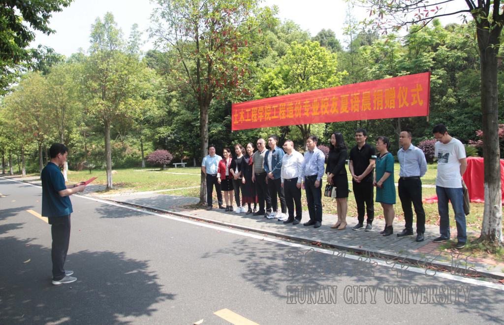 本网讯   2020年4月28日上午,我校在学校翠屏山举行校友捐赠仪式,湖南华科工程项目管理有限公司董事长、我校土木工程学院工程造价专业校友夏语晨为学校捐赠树木及石碑。副校长郑卫民、党委委员李斌、土木工程学院部分领导和教师代表参加仪式。