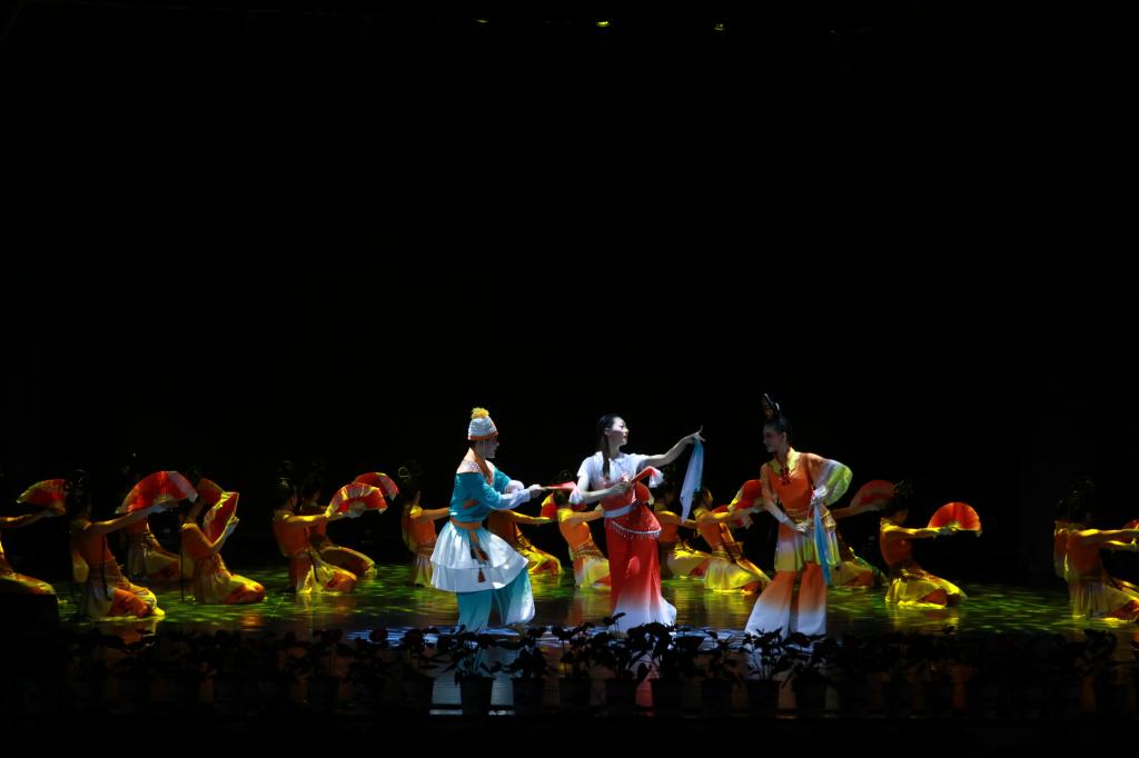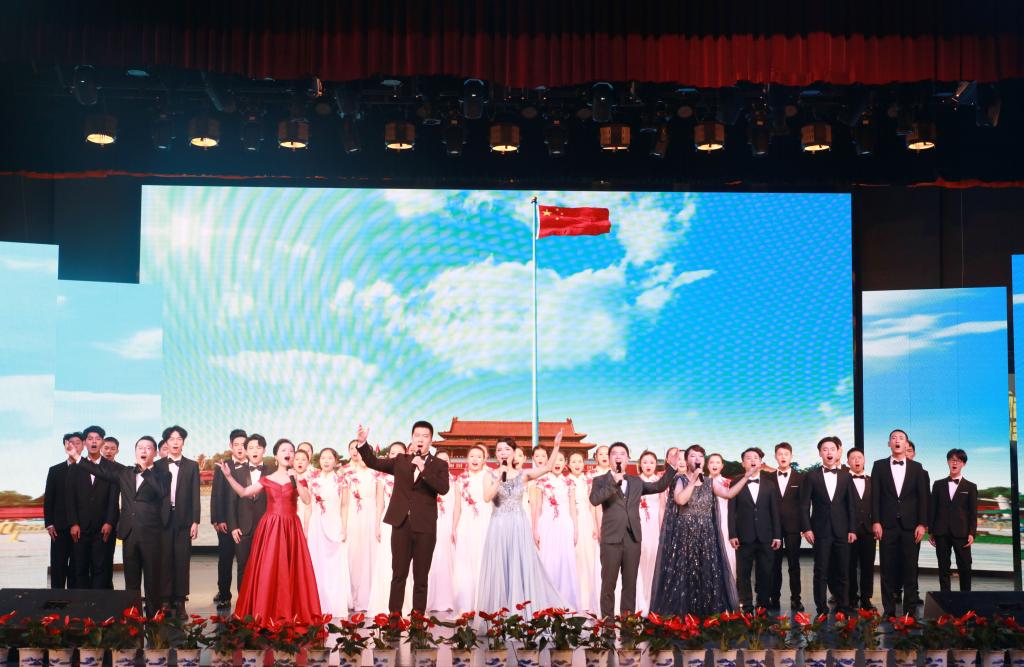 在“欢庆”篇章中,艺术学院学子为观众献上民乐合奏《欢庆校园》和原创舞蹈《花鼓情·薪火赓续》。器乐演奏热烈明快,舞蹈演绎优美动人,令在场观众目不转睛。在“奋斗”篇章中,城院教师代表同艺术学院学子携手华丽出演的钢琴八手联弹、舞蹈《东归雁》及《奋进》,借助黑白琴键的跳跃和风姿绰约的舞姿将城院师生对学校的深情展现得淋漓尽致。大学生艺术团表演的快板书《新时代·新城院》全面贯彻城院“三全育人”综合改革思想,展现了年轻一代在新时代浪潮中勇挑重任的使命担当,击节铿锵的演唱给观众留下了深刻印象。“向往”篇章中的歌舞《我们都是追梦人》、歌曲《向往》以及舞蹈《额尔古纳河》唱响了城院音、舞出了城院魂,表达出城院人“争做城院骄傲”的追梦态度。最后,演出在《我的祖国》和《歌唱祖国》大合唱中圆满落下帷幕。