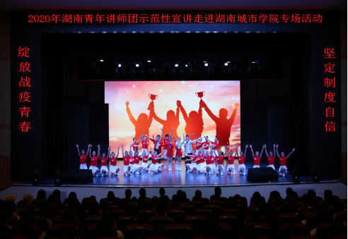 活动以我校大学生艺术团的《新时代 新城院》原创快板书表演开场。湖南省青年讲师团的陈科文、王皓、董青、张乐蒙、朱威宏五位讲师走进JN江南·(中国)体育官方网站,从自身的工作实际和典型事迹出发,向同学们分享了他们的抗“疫”故事,还原了抗“疫”一线画面。