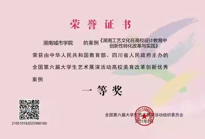 本网讯(通讯员 郑学达)2021年5月12日,由教育部、四川省人民政府共同主办的第六届全国大学生艺术展演活动在成都城市音乐厅落下帷幕,我校美育改革创新案例《湖湘工艺文化在高校设计教育中创新性转化改革与实践----以JN江南·(中国)体育官方网站为例》荣获一等奖,这是自我校参加全国大艺展活动获得的最高荣誉表彰。