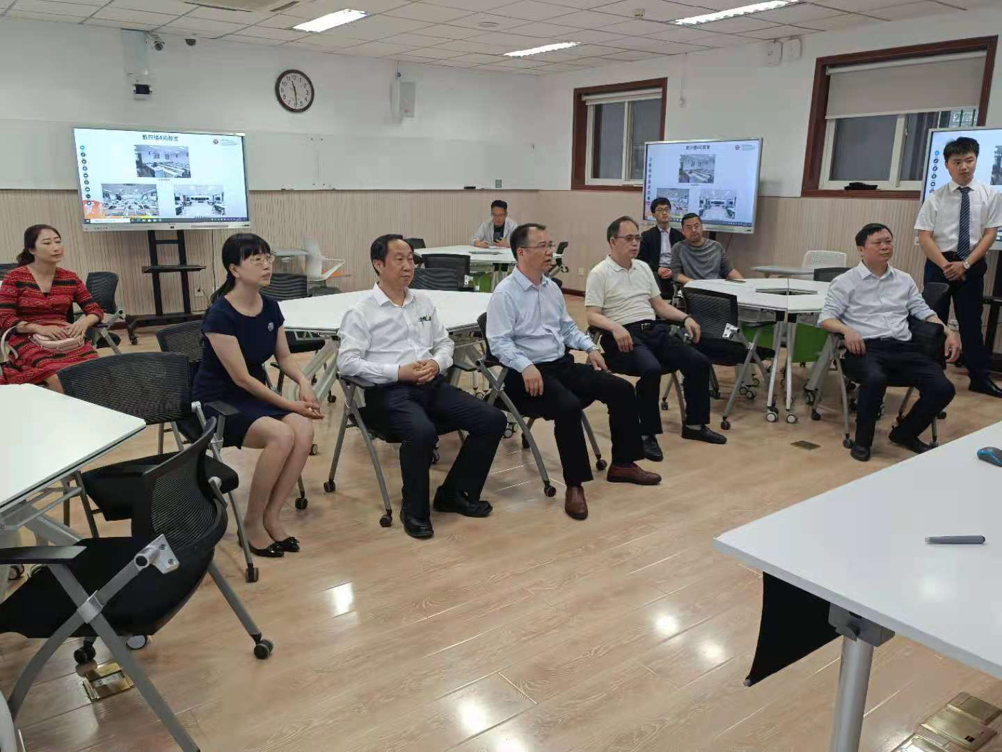 胡百精对该校的情况做了简要介绍,重点介绍了该校在智慧教学方面的举措与经验。随后双方就党史学习教育、智慧教学、学科建设与研究生教育等相关情况深入交换了意见。