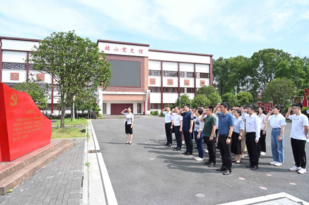 “我志愿加入中国共产党,拥护党的纲领,遵守党的章程……”在金家堤支部陈列馆前坪,面对鲜红的党旗,全体师生党员整齐列队,在党委副书记何旭娟领誓下,庄严地高举右手,重温入党誓词,铿锵有力的誓言在陈列馆上空激荡。