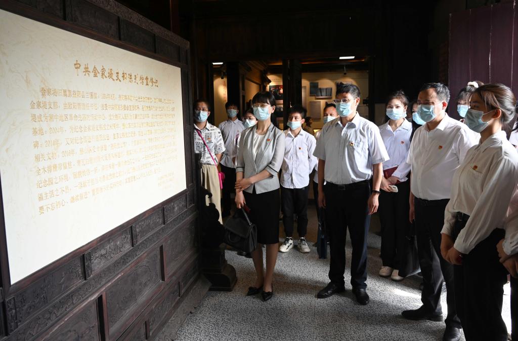 随后,大家怀着崇敬的心情,来到金家堤党支部陈列馆。1924年6月,益阳籍早期中共党员欧阳笛渔、欧阳泽、夏曦等人在此成立了中共金家堤支部,是益阳境内第一个党支部,也是湖南最早的农村党支部。自此,金家堤成为湘中地区革命先驱的活动中心,工农革命的星星之火也由此燃遍益阳这片热土。陈列馆里,一件件实物,一张张照片,一幅幅影像,将大家带回到老一辈革命家艰苦奋斗的峥嵘岁月,让大家了解了欧阳笛渔、欧阳泽等早期共产党员的成长之路。
