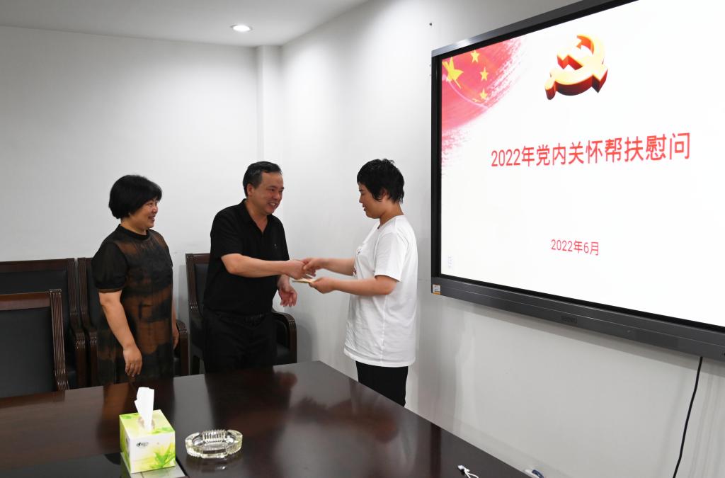 校党委委员、组织部部长吕贤军为湖南省党内关怀帮扶对象何童同学颁发慰问金。