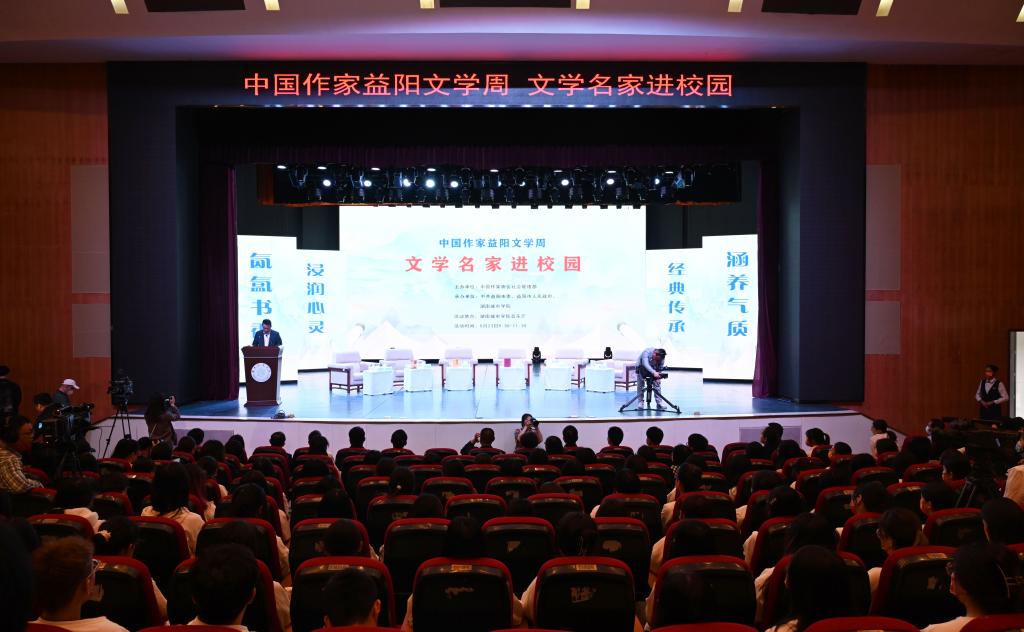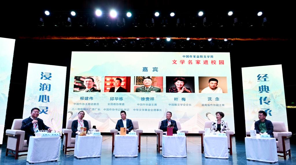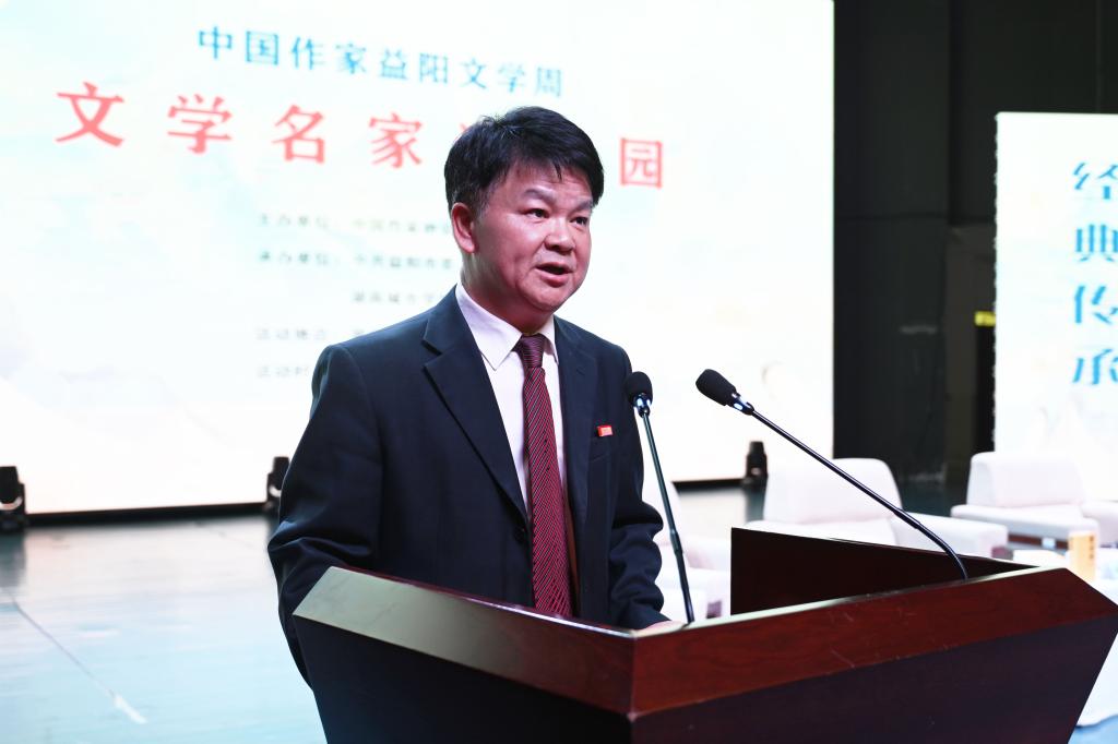 汤放华代表学校全体师生对与会作家和嘉宾的到来表示热烈欢迎。他表示,有着2000多年历史的益阳,人文积淀深厚、文化价值多元、文化名人辈出,书香洒满了山乡大地。JN江南·(中国)体育官方网站作为益阳市最高学府,注重以文化人,以文赋能乡村振兴,成立了一批红色文化研究基地,立项了一批关于红色文化的国家级、省级重大科研教改项目,推动师生把红色文化资源利用好、把红色传统发扬好、把红色基因传承好。今天我们有幸迎来了一批文学名家走进校园,与他们面对面交流,共襄一场文化的盛宴,共赴一程精神的旅行。这是益阳人民的一件盛事,更是我们学校的一件盛事。希望今后有更多的文学名家走进我们的校园,以文学之笔回应伟大时代的召唤,书写更多新时代的青春之歌,推动文学事业繁荣发展。