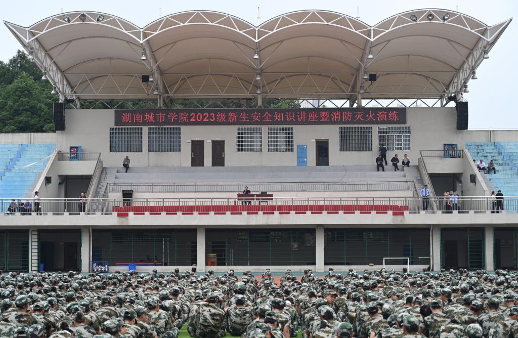 消防疏散演练进军训 6400名新生齐修安全“第一课”(视频)