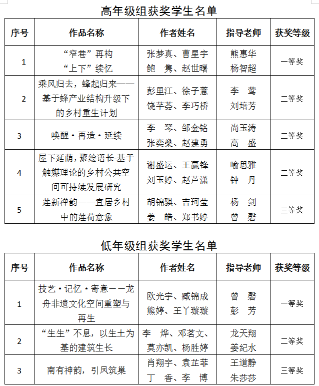湖南省大学生可持续建筑设计竞赛是全省普通高校大学生学科竞赛活动,旨在进一步深化省内各高校建筑学等相关专业教学改革,提升人才培养质量,加强相关院系之间的学科交流,展现学生的综合实践能力和专业教育教学成果。本次竞赛以“重生计划--乡村绿色建筑”为主题,共有来自省内包括中南大学、湖南大学等在内的17所高校参加,通过各高校校赛选拔,共收到17所高校288组作品,其中高年级组178份,低年级组110份,经由省内建筑知名专家组成的评审委员会组织复赛,我校建筑与城市规划学院共有8件作品入围,最终荣获高年级组一等奖1项,二等奖3项,三等奖1项;低年级组一等奖1项、二等奖1项、三等奖1项。同时,曾磬和熊惠华两位老师获评竞赛优秀指导老师。