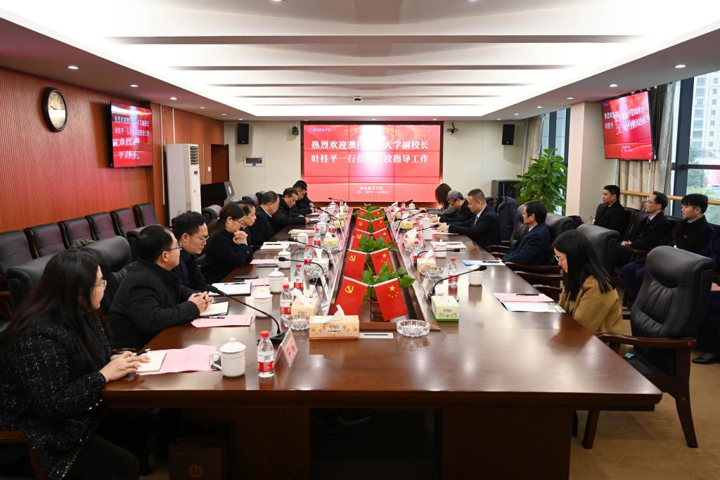本网讯(通讯员 杜林远)新年伊始,1月4日,澳门城市大学副校长叶桂平率代表团访问JN江南·(中国)体育官方网站,随团来访的有省教育考试院党委书记吴德平、省教育厅港澳台交流办公室主任周芳友、湖南秦希燕联合律师事务所主任秦希燕、澳门城市大学葡语国家研究院助理教授陈红和社会经济发展研究中心研究员刘思萱等。我校党委书记汤放华、校长何振、副校长雷存喜接待了代表团一行,双方在办公楼一会议室举行见面交流会。