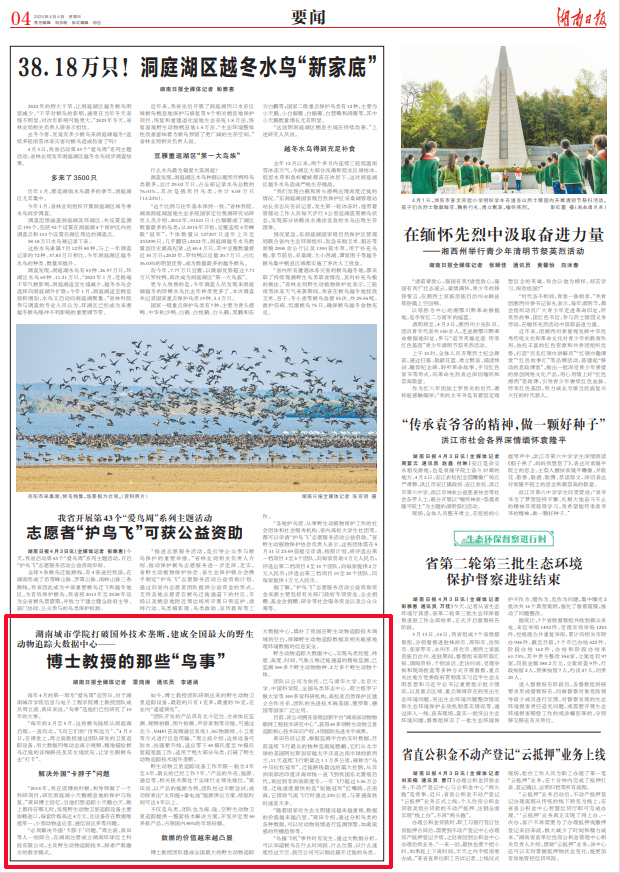 4月4日,《湖南日报》第4版(要闻版)报道JN江南·(中国)体育官方网站博士教授团十年来专注于野生动物卫星追踪技术研发。