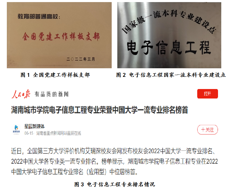 以习近平新时代中国特色社会主义思想为指导,坚持社会主义办学方向,全面贯彻落实党的教育方针。学院党委实施“一三四”党建工程,即:以“铸魂育人”为中心;以“对标入党誓词,检查政治忠诚;对标党员义务,检查履职尽责;对标时代先锋,检查自身差距”为主要内容开展“三对标三检查”党员常态化教育活动,引导党员做讲政治、讲作为、讲奉献的表率;以“做好课程思政、做强教学科研、做实人才培养、做深服务社会”四个重点为突破口,促进党建与业务工作深度融合,落实立德树人根本任务,有机融合“三全育人”和“五育并举”,推动学院高质量发展。近年来,学院获批全国党建工作样板支部1个、全国高校“双带头人”教师党支部书记“强国行”专项行动团队1个、全省教育系统先进基层党组织1个,入选湖南省高校教师党支部书记“双带头人标兵”2人、湖南省高校“青年教工党员示范岗”1人,有效助推了学院一流学科、专业建设和高质量人才培养。全国第三方大学评价机构艾瑞深校友会网发布校友会2022年中国大学一流专业排名,JN江南·(中国)体育官方网站电子信息工程专业在排名(应用型)中位居榜首。