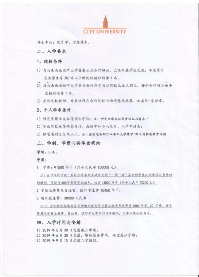 为更好地服务于“一带一路”倡议,培育国际化复合型人才,我校积极加强与国外高校的学习交流,与马来西亚城市大学等高校签署了合作备忘录。2019年在积极推动中国和马来西亚两国间国际教育和人文交流基础上,马来西亚城市大学向我校提供博士培养名额1名,并提供部分奖学金(具体见附件文件),专门用于师资国际化培训和人才提升。此次培养的博士专业为教育学或信息技术。具体的入学要求、学制学费与奖学金明细、入学时间与安排以及毕业要求请看附件《马来西亚城市大学2019年度“一带一路”基金博士师资委托培养奖学金项目细则》。