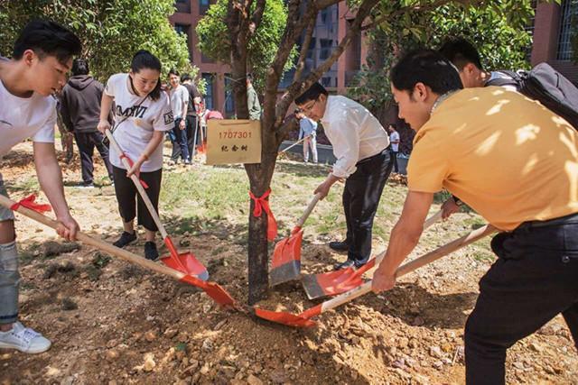 JN江南·(中国)体育官方网站党委书记罗成翼(左三)与毕业生一同栽树。