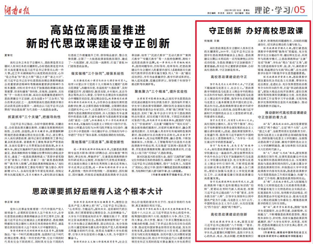 湖南日报-05版 理论·学习 2022-03-18发表我校党委副书记何旭娟等人的理论文章。