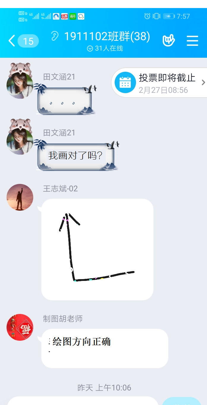 (2)胡庆春老师的《机械制图》经过多方调查分析,最终选择了“腾讯课堂直播+智慧树”的课程方案,“腾讯会议”作为备选和应急预案。上课时采用了利用智慧树完成了直播授课;授课过程中,充分利用平台功能,为学生讲解制图,学生们通过手机绘图与老师互动,学生的热情和参与度依然非常高。