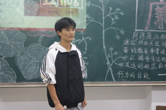 在班会上主持人强调了廉洁的重要性,带领同学们回顾了中国共产党反腐败的历程,增强同学们反腐意识,做廉洁大学生。同学们认真学习,积极参与回答主持人提出的问题。之后,主持人播放了与此次活动主题相关的视频,加深同学们的反腐与廉洁意识。班会最后,主持人提出了大学生“四严禁、六不准”及“三观、五讲”号召。引导同学们敬廉崇俭,反腐治奢。