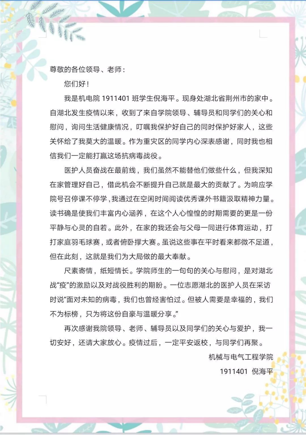 同心协力、英勇奋斗、共克时艰,2月13日,JN江南·(中国)体育官方网站机械与电气工程学院党总支书记徐畅贤、院长阳同光与学子紧密联系,并代表学院通过信件向身在抗击疫情前线的湖北籍学生送去学院的关怀和问侯。