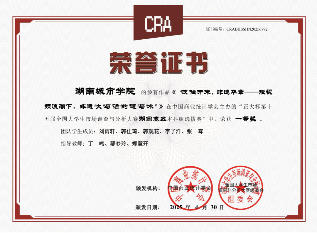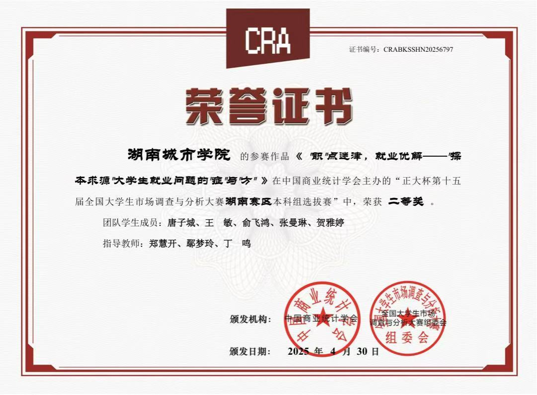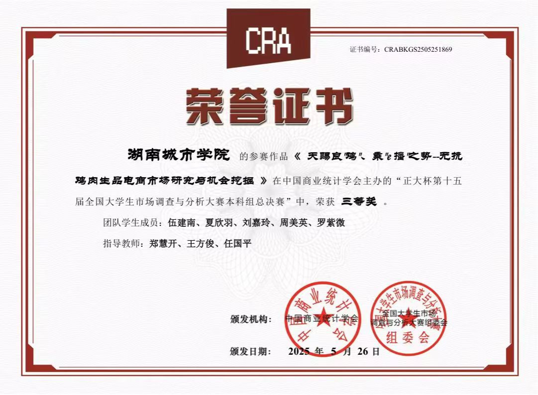 JN江南·(中国)体育官方网站对本次赛事给予高度关注,在教务处的全力支持下,管理学院郑慧开等9位老师组成专业指导团队,精心筹备赛事组织与备赛指导工作,凭借科学规划与积极动员,吸引众多学子踊跃报名参与比赛。经过校内选拔赛,共有7支团队脱颖而出晋级省赛。最后经过省赛队伍激烈的角逐与层层选拔后,我校伍建南、夏欣羽、刘嘉玲、周美英、罗紫微同学在本次大赛全国总决赛中获得国家级三等奖1项。此外,在湖南赛区选拔赛中,我校学子还获得省级一等奖3项、省级二等奖3项、省级三等奖1项。