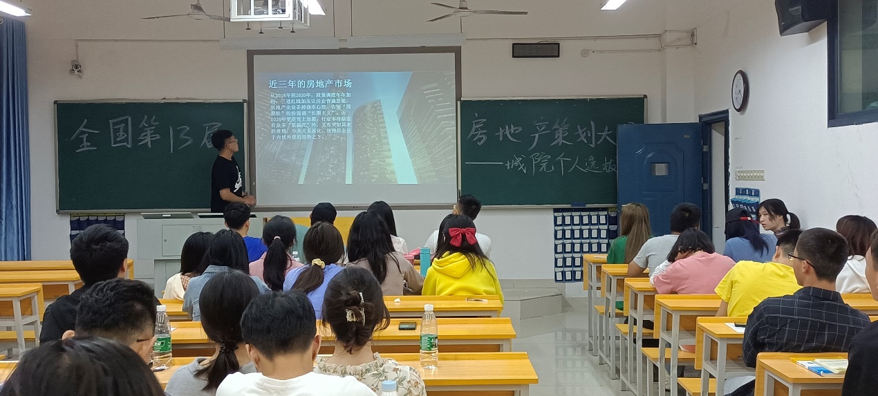 本次比赛全校已有三百多名同学积极报名参与,于5月9号晚上七点在管理楼开始别具一格的由学生担任评委的首轮选拔赛。首先,由李博学长为大家介绍比赛规则,本次比赛将汇报有关楼盘项目的综合分析、近三年来房地产的市场变化及个人看法,再由九位评委进行评分、择优录取。参与比赛的同学们都准备得十分充分,赛场气氛紧张而又热烈。