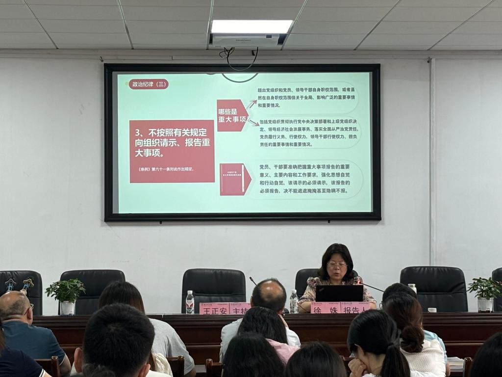 徐姝围绕“在重大原则问题上同党中央保持一致”“不发表不传播有严重政治问题的言论”“严格执行党中央决策部署”“对党组织忠诚老实”“坚定理想信念”“涉外活动中注意有政治问题的言行”“履行管党治党政治责任尽忠职守”“坚守党的政治规矩”八个方面带领大家重点学习了《中国共产党纪律处分条例》中党的政治纪律。
