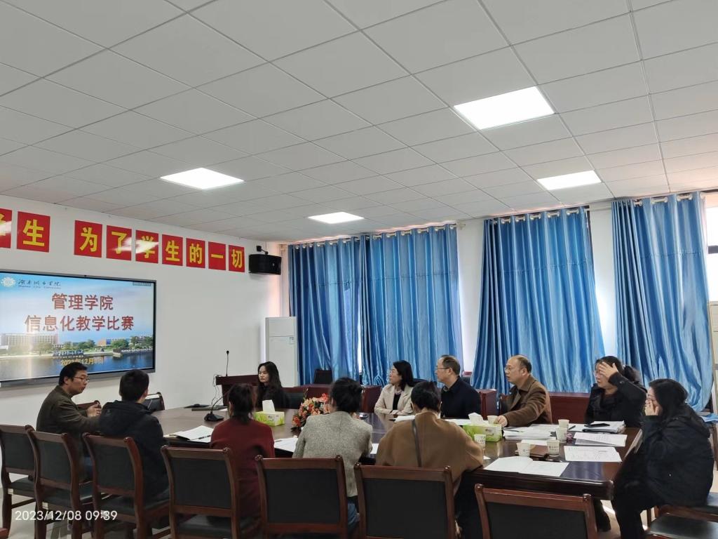 根据学校《关于举行“教学30佳”教学竞赛活动的通知》(湘城院发{2023})号,通过精心安排与准备,管理学院信息化教学竞赛于12月08日上午在管理楼622会议室如期进行。学院有7名教师参加竞赛,现场评委为研究生院院长孙倩、学院院长汤勇、副院长刘刚。