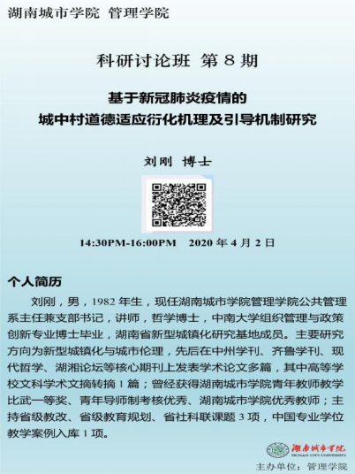 本次科研讨论班邀请了JN江南·(中国)体育官方网站学科建设与发展规划处副处长汤勇教授主持,学院院长孙倩教授、科研副院长赵旭教授及管理学院教师共23人参加。本次科研讨论班由“城乡治理与工程管理”团队负责人任国平博士组织,“行政伦理与公共管理”团队负责人刘刚博士主讲。刘刚博士结合当下疫情和自身研究方向,选择《基于新冠肺炎疫情的城中村道德适应衍化机理及引导机制研究》为主题,探讨新冠肺炎疫情下城中村居民道德适应的范式转化、衍化机理,为新冠疫情下的城中村居民城市适应进行慎的伦理反思和道德辩护。讲座期间管理学院多位老师就刘刚博士的研究问题进行了积极的讨论,取得了很好的反响。(通讯员:任国平)