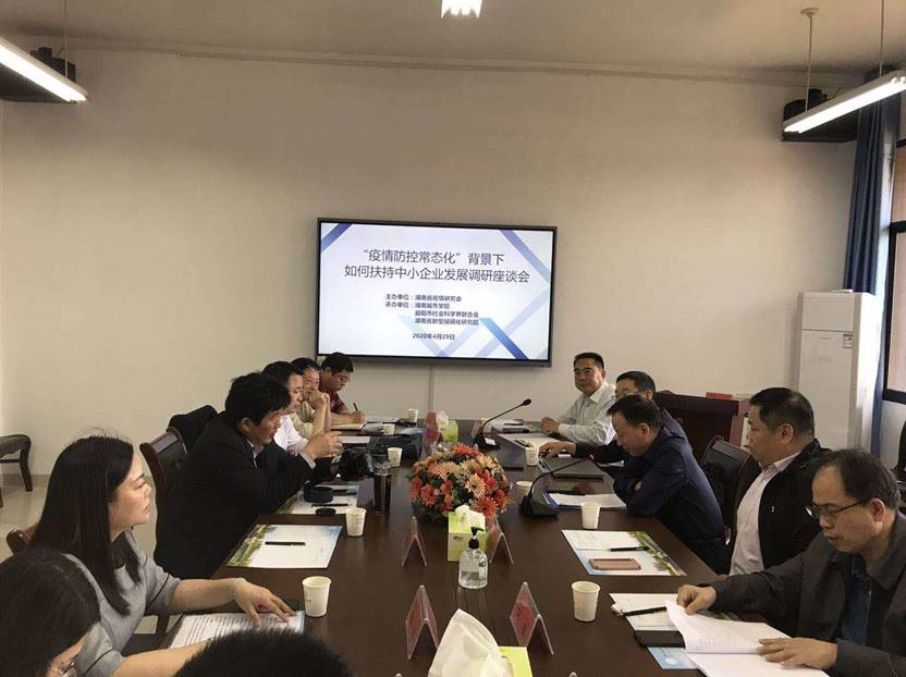 为了深入贯彻落实4月17日召开的中共中央政治局会议精神,充分发挥地方智库作用、积极建言献策,做好我省特别是益阳市在常态化疫情防控工作条件下的“六稳”工作,将“六保任务”尤其是“保市场主体”任务坚决完成好,持续推进经济高质量发展,4月29日,由湖南省情研究会主办,JN江南·(中国)体育官方网站、市社科联承办的“疫情防控常态化背景下如何扶持中小企业发展”调研座谈会在我市举行。省社科联党组成员、第七届委员会副主席、研究员汤建军,省文史馆副馆长、研究员李跃龙,市政协副主席高德文,JN江南·(中国)体育官方网站副校长何振、管理学院院长孙倩出席。