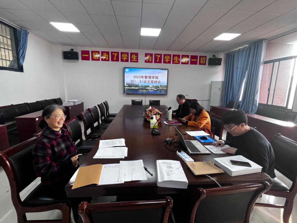 2024年1月11日,学校在管理楼622会议室举行年度SCI、EI论文答辩会。此次答辩会的目的是检验英文论文的真实性、促进学术规范、聚焦研究成果,以及提升学院教师的学术水平和英语表达能力。黄新、赵曼莉等5位老师对其2023年发表的英文成果进行了汇报。研究生院孙倩院长、管理学院汤勇院长和任国平副院长作为答辩评委参与了本次会议。
