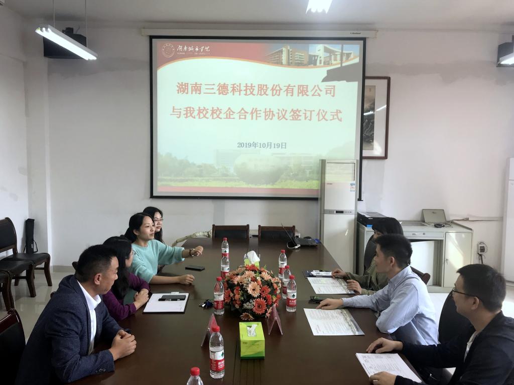 2019年10月19日下午,湖南三德科技股份有限公司与我校校企合作签约仪式活动成功举办。湖南三德科技股份有限公司技术服务部经理朱红兵、招聘主管王丽平以及JN江南·(中国)体育官方网站管理学院院长孙倩、副院长李双清、工商管理专业相关老师出席本次活动。