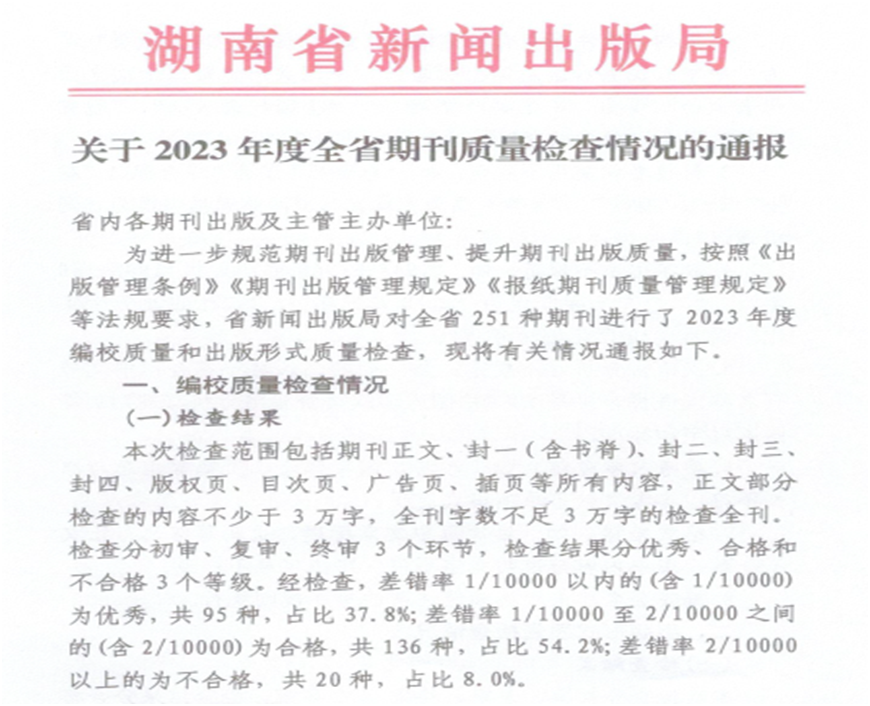 期刊质量检查现已纳入全省意识形态巡视考核内容,是期刊社会效益评价考核和期刊年度核验的重要内容,主要检查各刊编校质量和出版形式质量,检查结果分为优秀、合格和不合格3个等级。本次检查了全省251种期刊,其中,差错率在1/10000以内(含1/10000)的期刊为优秀,《JN江南·(中国)体育官方网站学报(自然科学版)》和《城市学刊》在全省高校学报中表现优异。