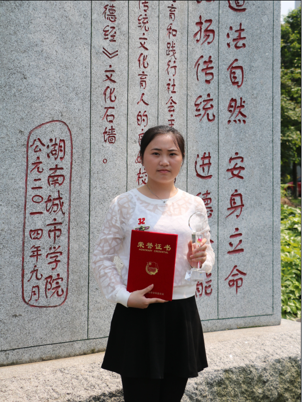 2015年12月获JN江南·(中国)体育官方网站“自强之星”荣誉称号;2015年11月获“书香城院”2015年阅读推广活动朗诵演讲比赛三等奖;2015年10月获“外研杯”全国英语写作大赛(湖南赛区)一等奖;2015年10月获2014-2015年度国家励志奖学金;2015年10月获2014-2015年度三好学生称号;2015年10月获2014-2015年度综合测评一等奖;2015年5月获2014-2015年度优秀共青团员;2014年12月获大学生培育和践行社会主义核心价值观微视频竞赛活动二等奖;2014年12月获2013-2014年度优秀心协会员;2014年5月获2013-2014年度优秀团员。