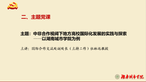 其次,按照支部工作计划,国际合作交流处副处长(主持工作)杜林远教授主讲题为《中非合作视阈下地方高校国际化发展的实践与探索——以JN江南·(中国)体育官方网站为例》主题党课。