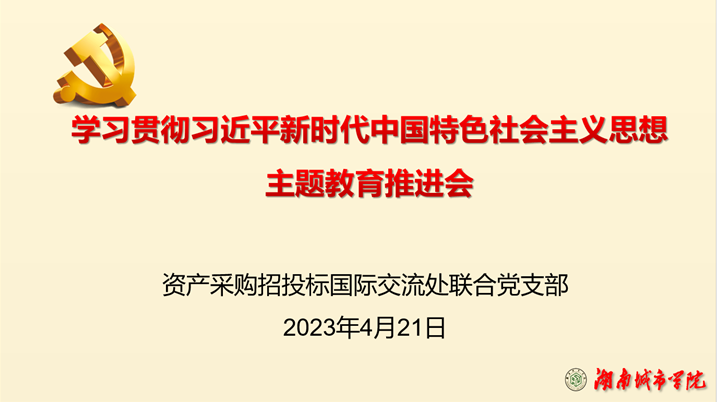 2023421日下午,资产处、采购与招投标管理中心、国际交流处联合党支部在一办公楼131室(支部活动室)召开了学习贯彻习近平新时代中国特色社会主义思想主题教育推进会,党支部书记肖爱民主持。